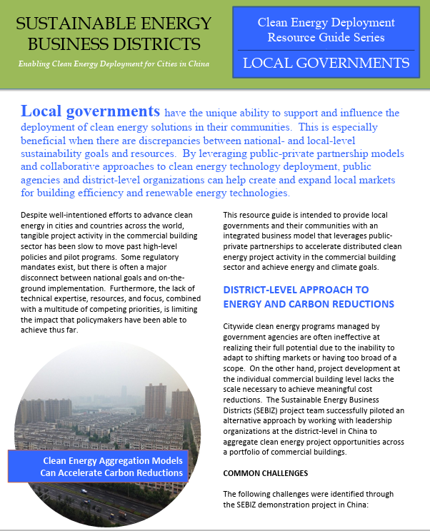 As a part of efforts to facilitate the adoption of clean energy technologies in Chinese business districts, the SEBIZ program team has documented valuable lessons learned in a series of sector-specific Clean Energy Deployment Resource Guides. These guides expressly written for local governments, commercial building owners, and clean energy solutions providers in the commercial building market detail how public-private partnerships as well as project aggregation can benefit all parties by lowering costs and barriers to market entry.